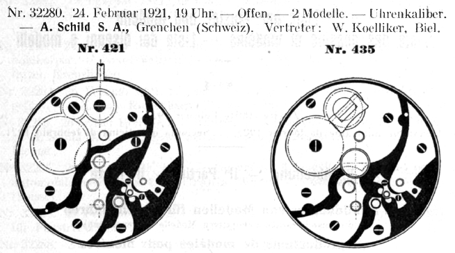 - Identification: Registered by A. Schild on 24.02.1921 in the Swiss Official Gazette of Commerce as model no. 421. Model No. 421 is not an official caliber designation, but was used to register the design.