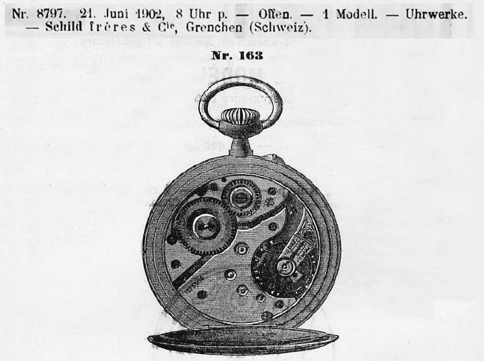 - Identification: Movement marked with SFC (Schild Frères & Co.) in a cross. Registered by Schild Frères in the Swiss Official Gazette of Commerce on 21.06.1902 as model No. 163. Model No. 163 is not an official caliber designation, but was used to register the design.